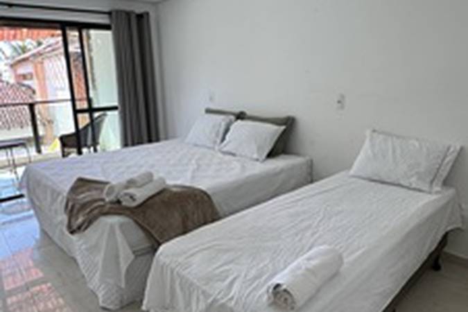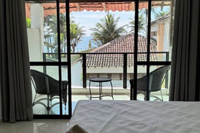 A suíte da Superior Vista Mar acomoda até 3 hóspedes em uma cama casal + uma cama solteiro. Conta com varanda privativa, mesa de apoio e cadeiras para relaxar apreciando a praia, e é bem equipada para sua comodidade.