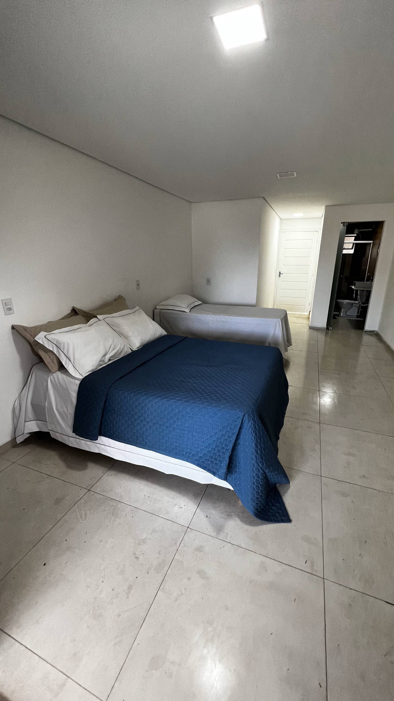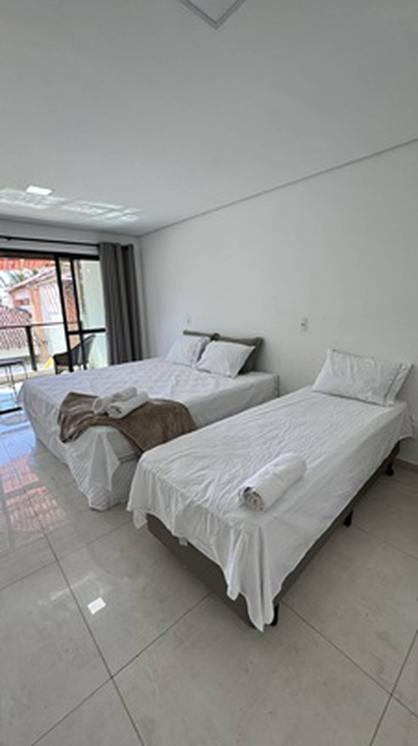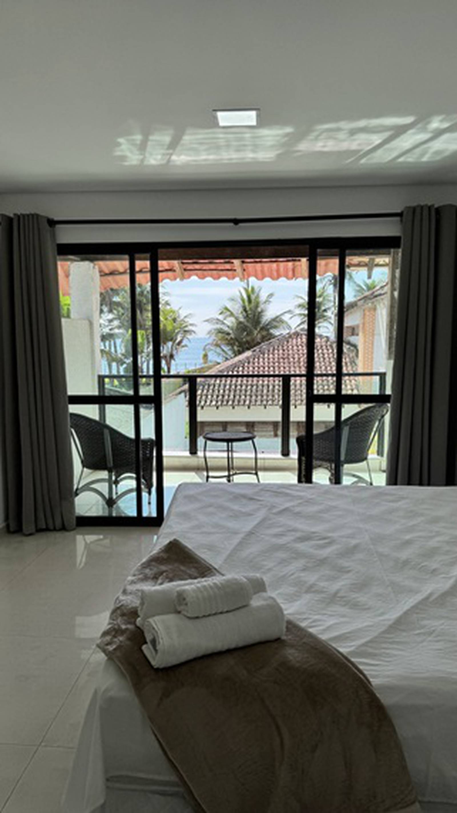 A suíte da Superior Vista Mar acomoda até 3 hóspedes em uma cama casal + uma cama solteiro. Conta com varanda privativa, mesa de apoio e cadeiras para relaxar apreciando a praia, e é bem equipada para sua comodidade.